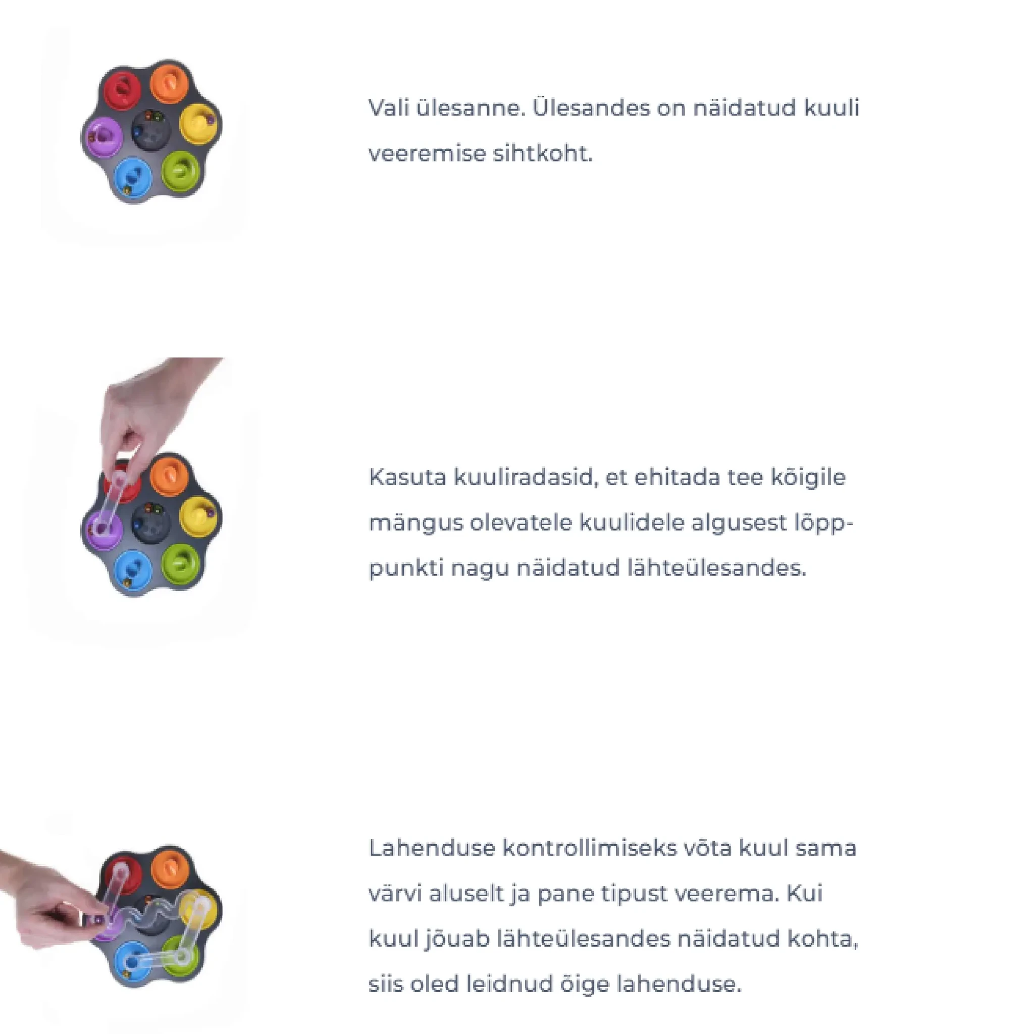 Alusta ülesande valimisest, paiguta kuulid ja alused õigesti ning kasuta erinevaid rajatükke tervikliku kuuliraja loomiseks. Iga ülesanne näitab minimaalset radade arvu, millega lahendus on võimalik, pakkudes parajat mõtlemis- ja planeerimisväljakutset. Valmis lahendust saad kontrollida, lastes kuuli rajale ja jälgides, kas see jõuab õigesse sihtkohta.