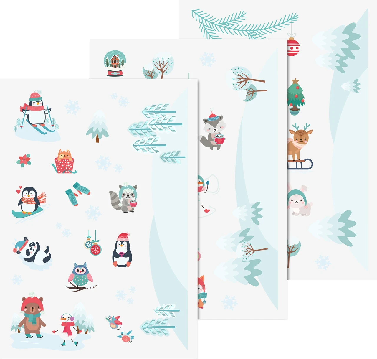 Aknakaunistuskleebiste komplekt, mis sisaldab 3 lehte suuruses 21 x 29,7 cm. Kleebised on värvikirevad ja sobivad ideaalselt akende, peeglite või muude siledate pindade kaunistamiseks.