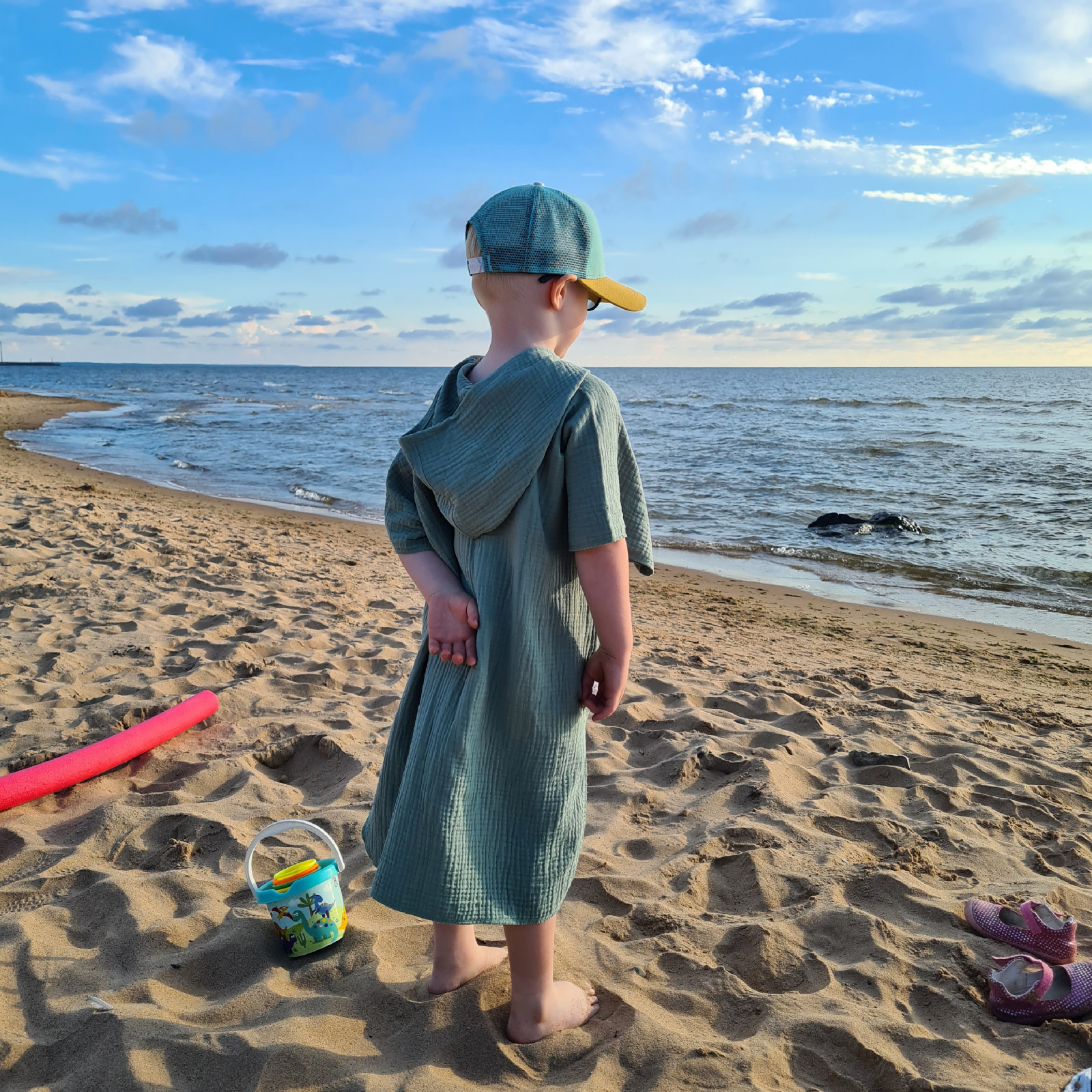 Musliin imab enda sisse kogu niiskuse ja kuivab kiiresti, samas hoiab keha soojas. Kapuuts aitab juukseid kuivatada ja kaitseb rannas päikese ja tuule eest. Vajadusel saab pontšo kaeluse juurest rohkem kinnipoole panna, selleks on lisatud trukid.