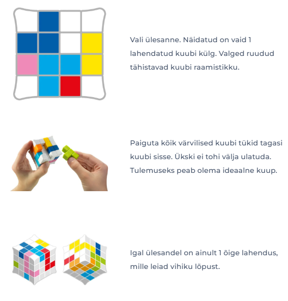 Kõlab lihtsana? Tegelikult saab seda kuupi kokku panna üle 50 erineval viisil, kuid just õige lahenduse leidmine võib olla tõeliselt väljakutsuv! Mänguga on kaasas 48 nuputamisülesannet koos vihiku lõpus olevate lahendustega – et iga mängija saaks end proovile panna ja oma lahendused üle kontrollida.