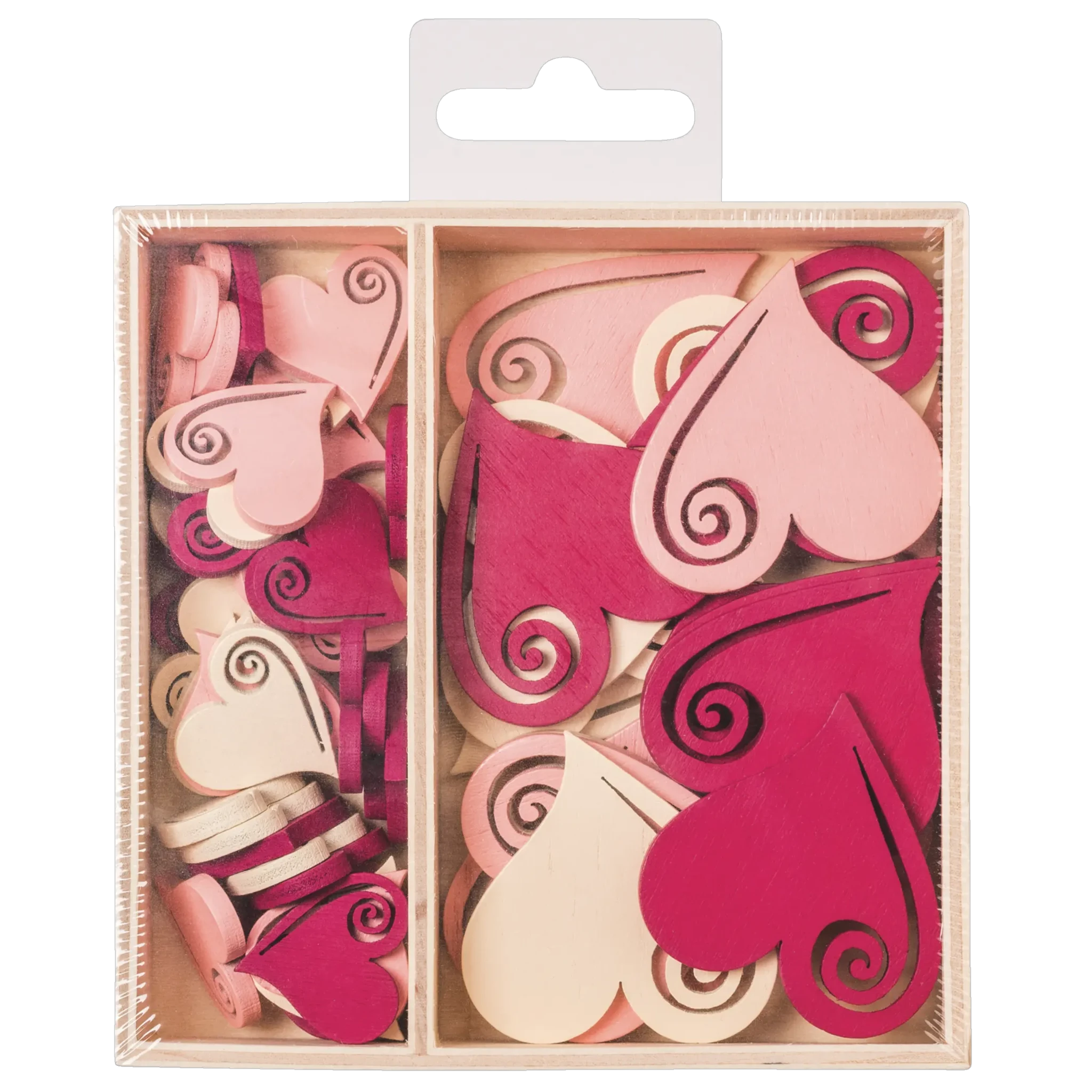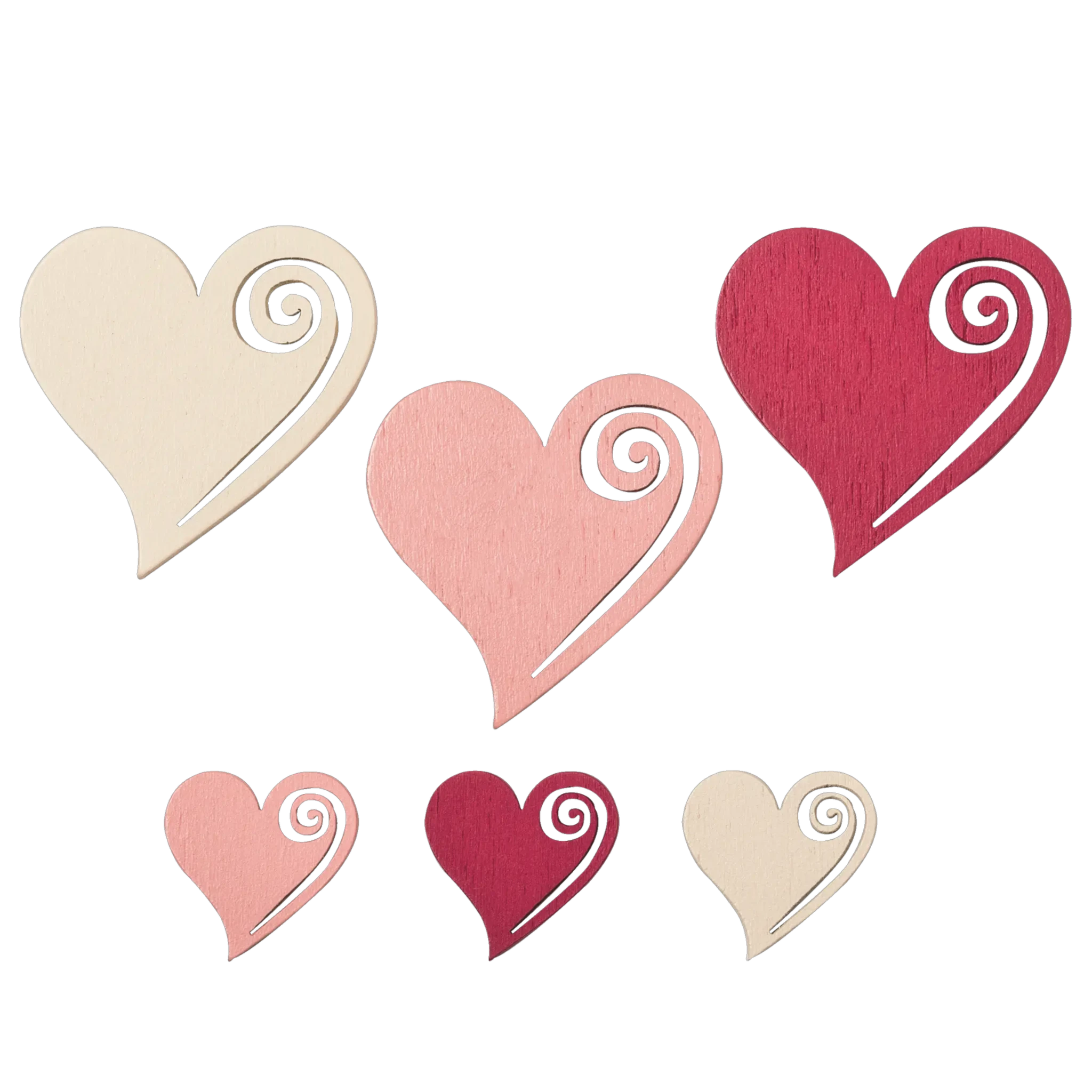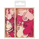 Romantilised puidust südamekujulised kaunistused sobivad ideaalselt kaartide, kinkide, lauakaunistuste ja erinevate meisterdusprojektide jaoks. Komplekt sisaldab 54 detaili kolmes värvitoonis: elevandiluuvärvi, heleroosa ja punane.