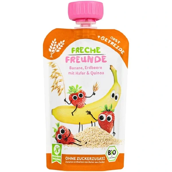 Freche Freunde missiooniks on aidata lastel luua parem ja loomulikum suhe puu- ja köögiviljadega. See mahe banaani- ja maasikapüree kinoaga on maitsev ja praktiline vahepala, mis sobib ideaalselt nii kooli, trenni kui ka väljasõidule.