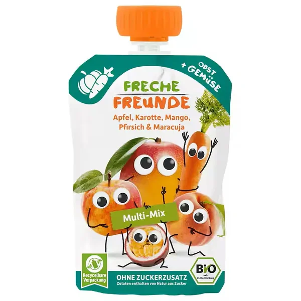 Freche Freunde eesmärk on aidata lastel juba varakult luua loomulik ja positiivne suhe puu- ja köögiviljadega. See mitmekülgse maitsekooslusega püree ühendab endas õuna, porgandi, mango, virsiku ja passionivilja, pakkudes lapsele mahedat ja tasakaalustatud maitsekogemust.