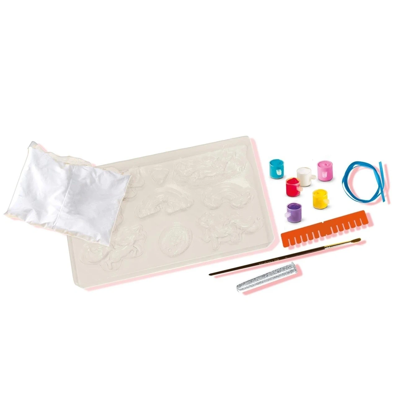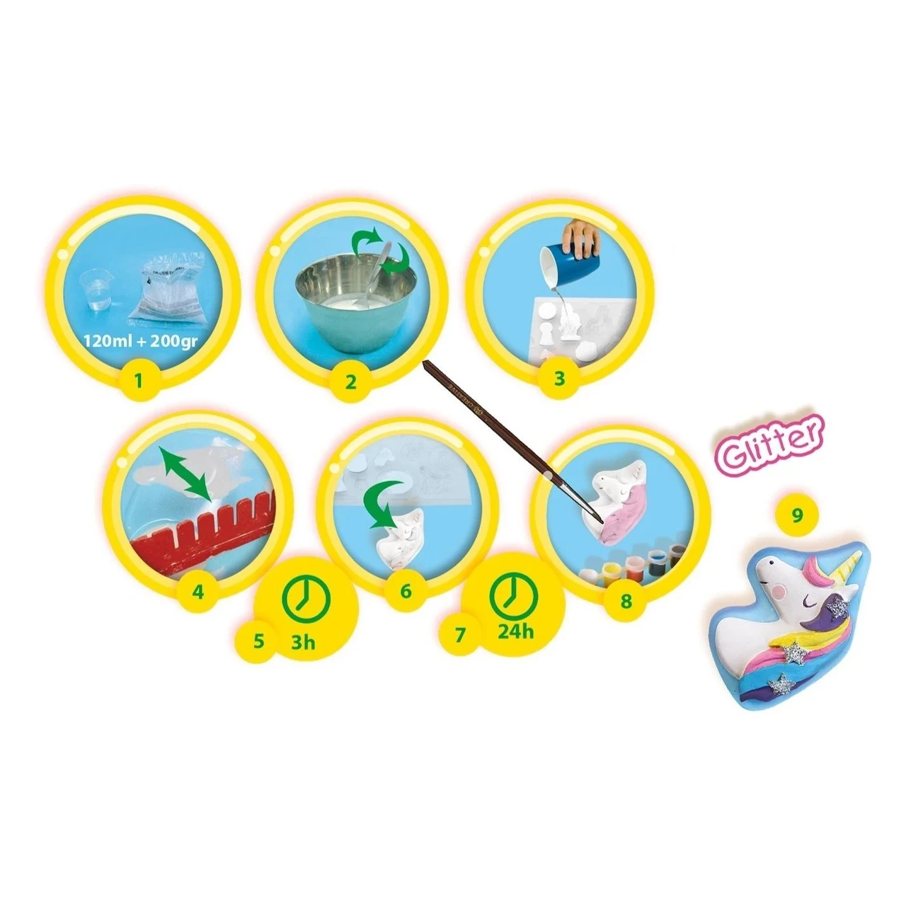 Kipsfiguuride komplekti abil saad valmistada mitmesuguseid kipsist ükssarvikukujusid. Vala kips vormi ja lase sel taheneda. Seejärel kasuta komplektis olevaid värve, et kujukesed muuta just selliseks, nagu soovid. Tegutsemine arendab loovust, keskendumist ja peenmotoorikat ning pakub lõbusat loomingulist tegevust.