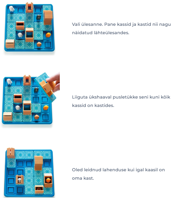 Komplektis on mängulaud, 5 kassi, 4 kastidega pusletükki ja ülesandevihik.
