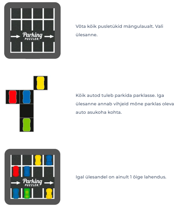 Selles põnevas SmartGamesi loogikamängus tuleb leida igale autole õige parkimiskoht, kasutades ülesande kaardil olevaid vihjeid ja suundi.