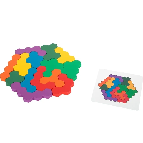 Tõeline ajutrenn väikestele nuputajatele! Selle erikujulise puidust pusle eesmärk on paigutada mesikärjekujulised detailid õigesti mängukaartidel etteantud mustri järgi.