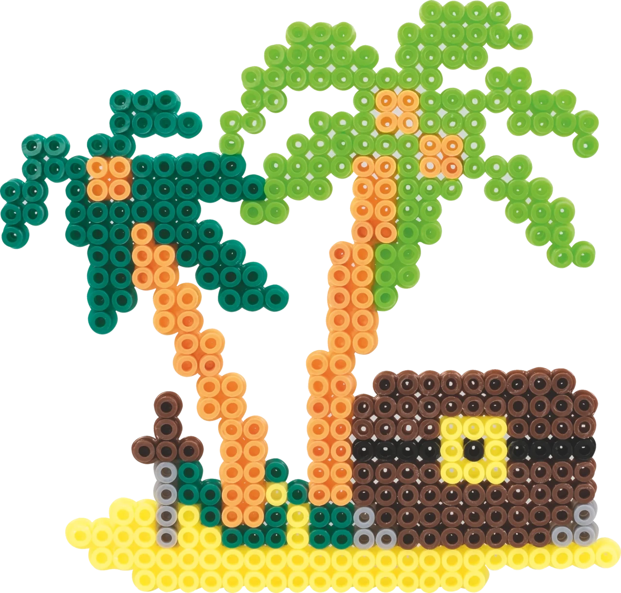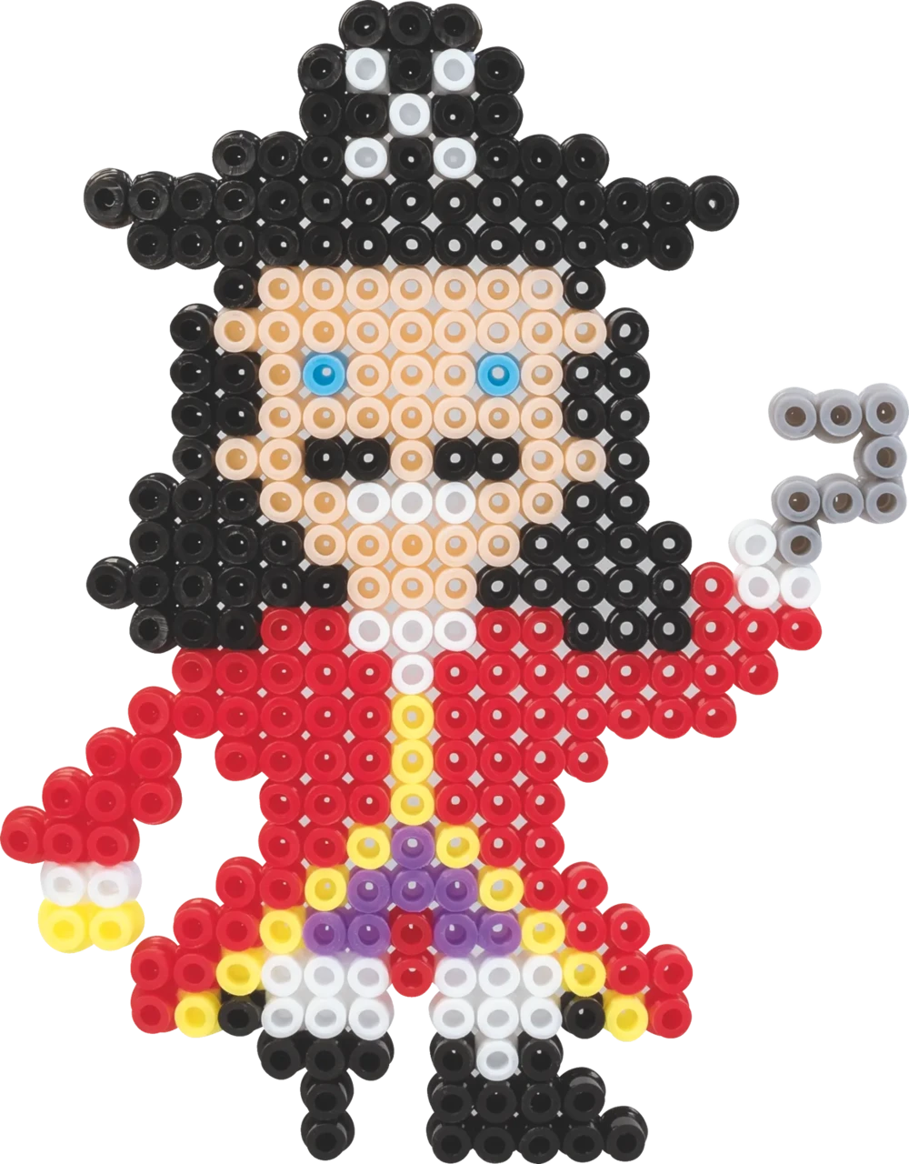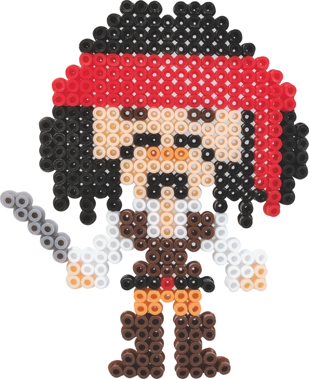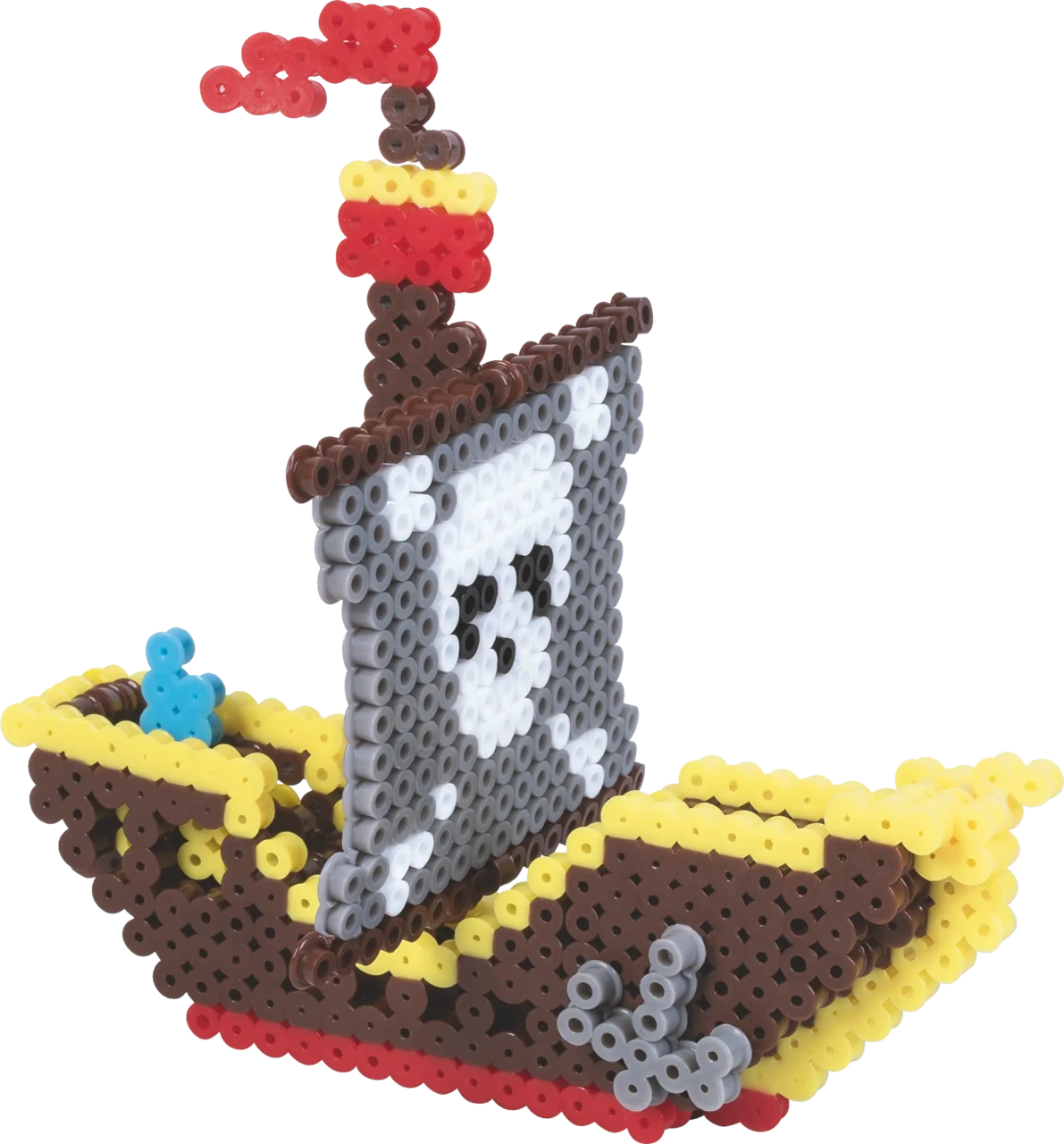 Kaheksa šablooni (3 piraati, papagoi, aardesaar, aardekirst, piraadilaev ja piraadilaev 3D) aitavad samm-sammult luua detailseid ja mängulisi figuure. Aseta pärlid pintsettidega alusele vastavalt šabloonile, kata triikimispaberiga ning sulata keskmise kuumusega triikrauaga. Pärast jahtumist eemalda kujund aluselt ja vajadusel triigi ka teiselt poolt.
