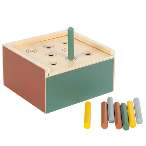 Komplektis on 4 münti, 8 pulka ja 4 klotsi. Mäng arendab peenmotoorikat, käe-silma koordinatsiooni ning värvide ja kujundite tundmist. Samuti aitab see mänguliselt mõista objekti püsivuse põhimõtet – ese on olemas ka siis, kui see silma alt kaob.