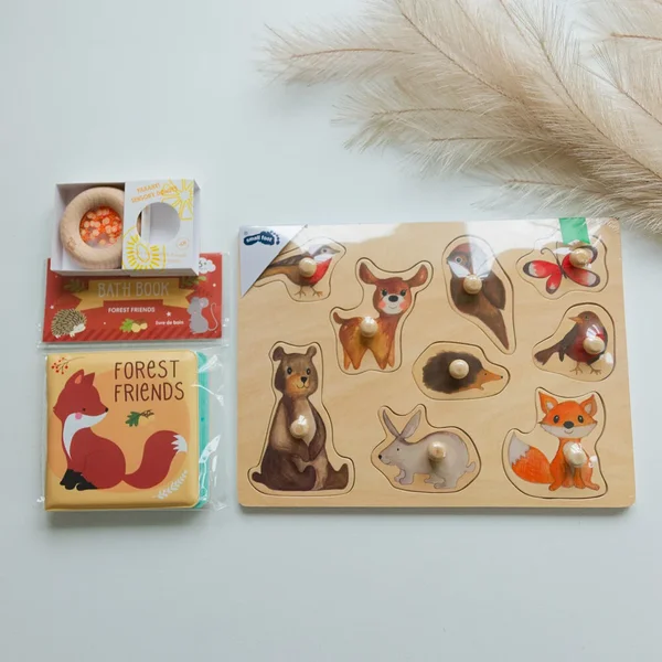 NB! Pakkide sisu võib erineda pildil näidatust – värvid ja teemad on valitud juhuslikult. See tähendab, et kingitus, mis koosneb nupupusleat, sensoorsest kõristist ja vanniraamatust pannakse kokku juhuslikult.