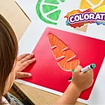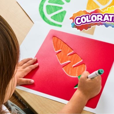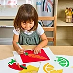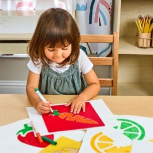 Suur šabloon koosneb kahest osast. Aseta šabloon paberile ja vajadusel kinnita see teibiga, et see paigast ei liiguks. Seejärel saab lapsega koos šablooni sisse värvi tupsutada švammi või pintsliga. Ka eemaldatud sisetükki võib kasutada eraldi šabloonina – kui seda äärtest tupsutada, tekib vahva kujund.
