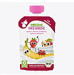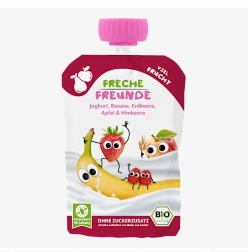 Freche Freunde. Üks tuub vastab ühele portsjonile viiest päevasest soovituslikust puu- ja köögiviljadest. 39% jogurt* (kuumutatud), 30% banaanipüree*, 23% maasikapüree*, 3% vaarikapüree*, 3% õunapüree*, riisijahu *. Tärniga tähistatult on pärit mahepõllumajandusest. Sobilik alates 12. elukuust.