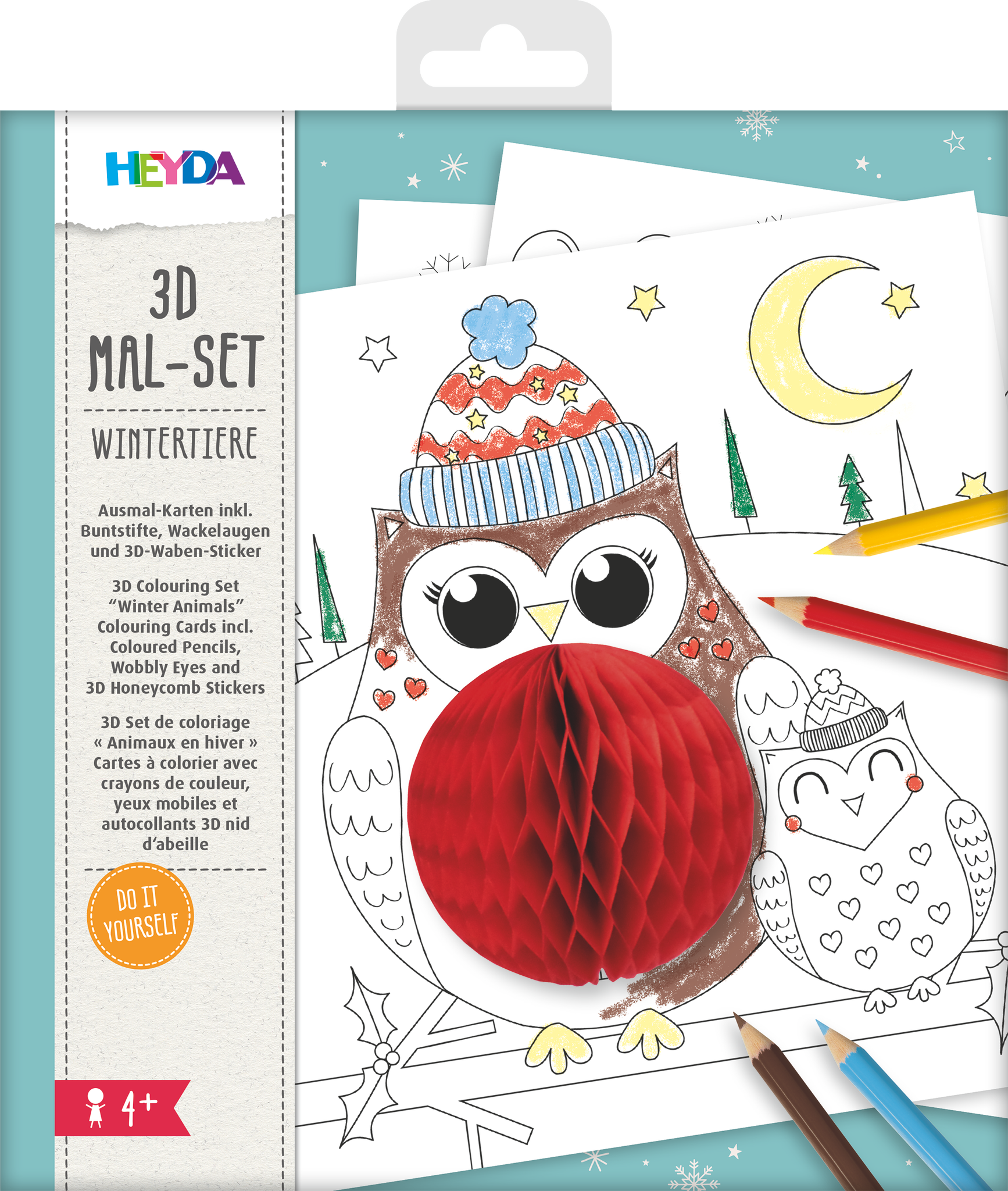 Komplektis: 4 värvimiskaarti, 6 värvipliiatsit, liikuvaid silmi ning 3D efektiga meekärjekleebiseid, kokku 15 osa